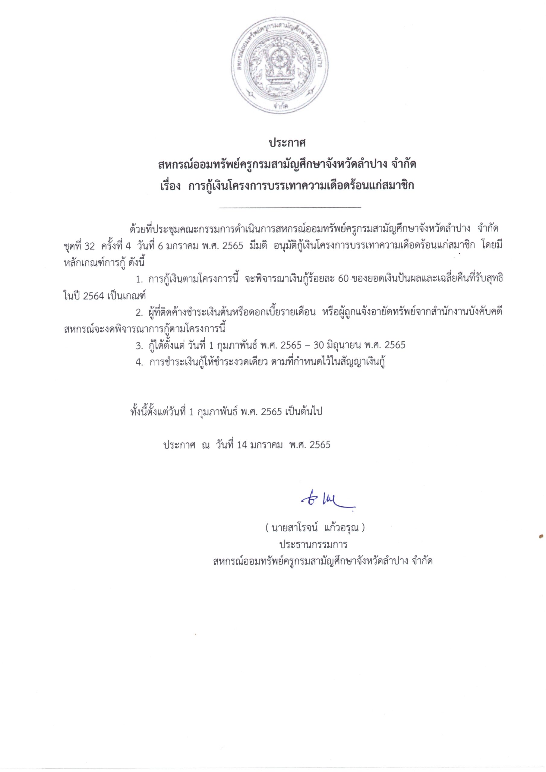 ประกาศ โครงการกู้เงินบรรเทาความเดือดร้อนแก่สมาชิก