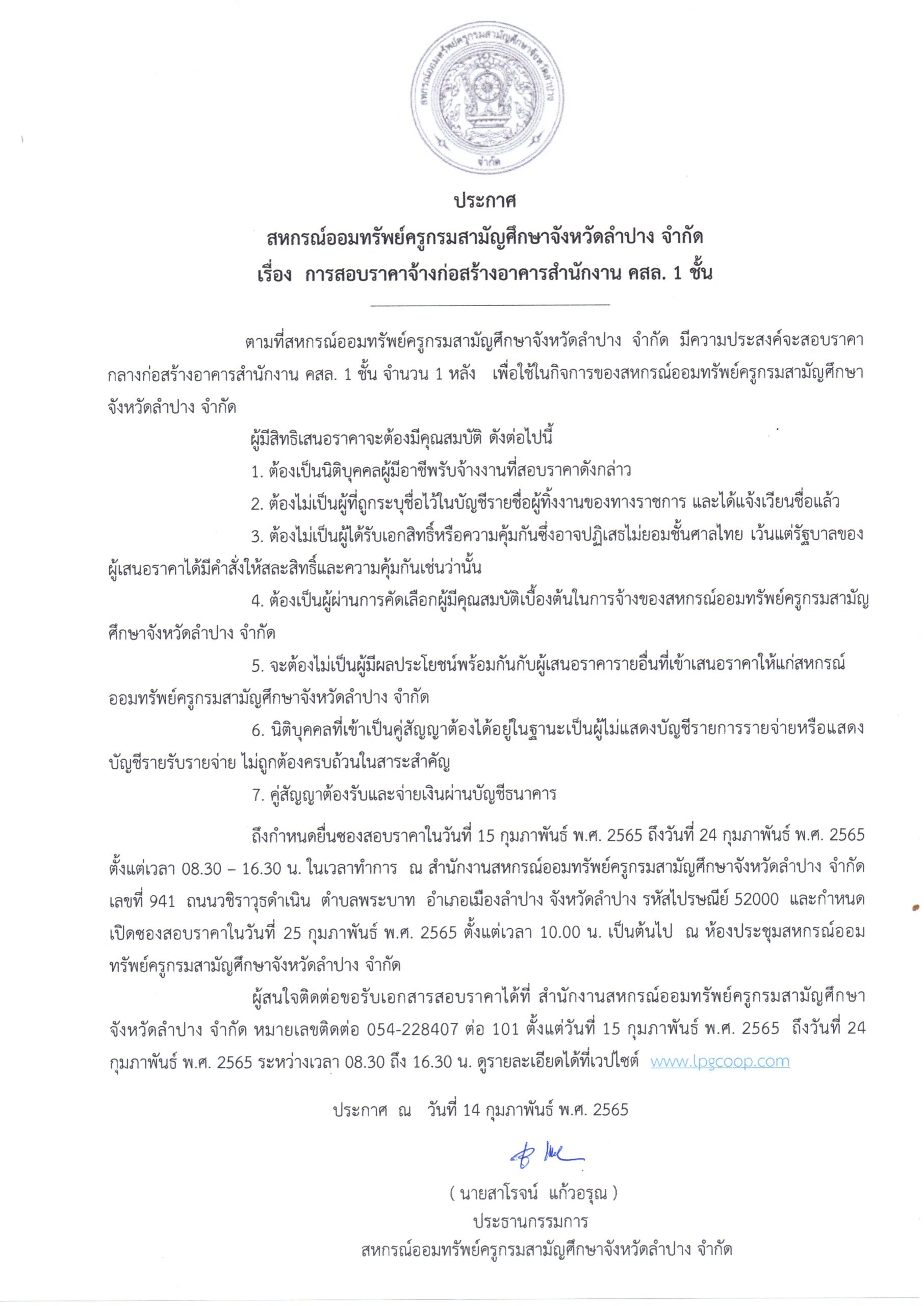 ประกาศ เรื่องการสอบราคาจ้างก่อสร้างอาคารสำนักงาน คสล. 1 ชั้น
