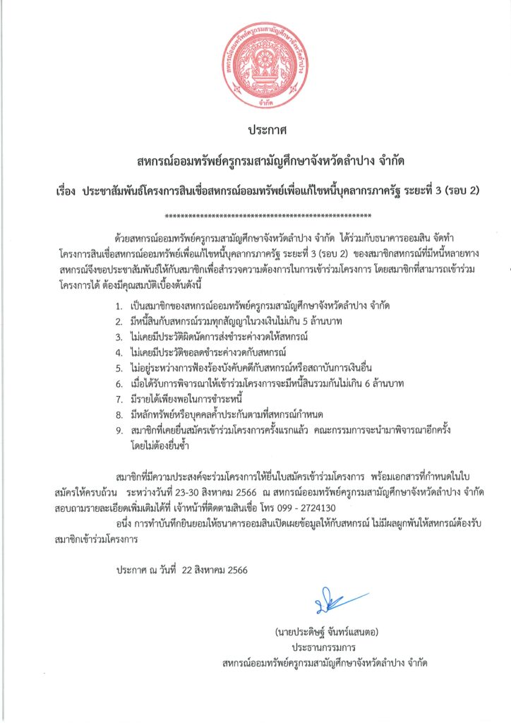 ประชาสัมพันธ์โครงการสินเชื่อสหกรณ์ออมทรัพย์เพื่อแก้ไขหนี้บุคลากรภาครัฐ ระยะที่ 3 (รอบ2) คลิกลิ้งค์ไฟล์ใบสมัคร